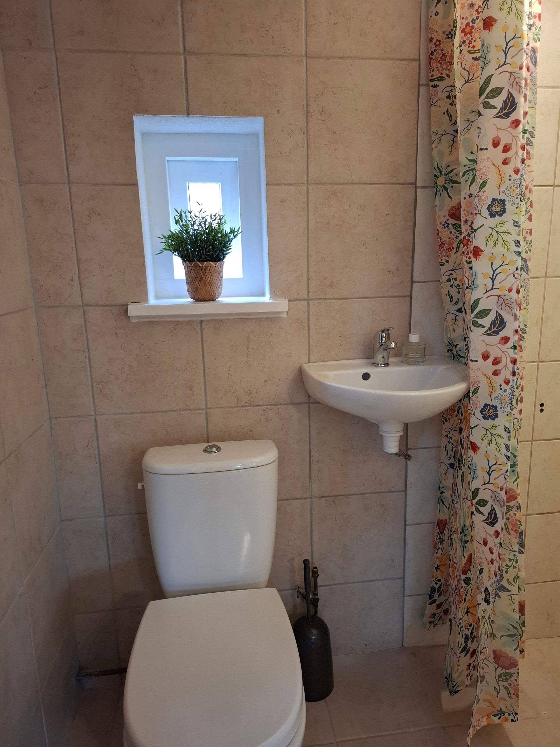 De badkamer is voorzien van een kleine wastafel, douche met mengkraan en een toilet. Handdoeken zijn aanwezig om te gebruiken.