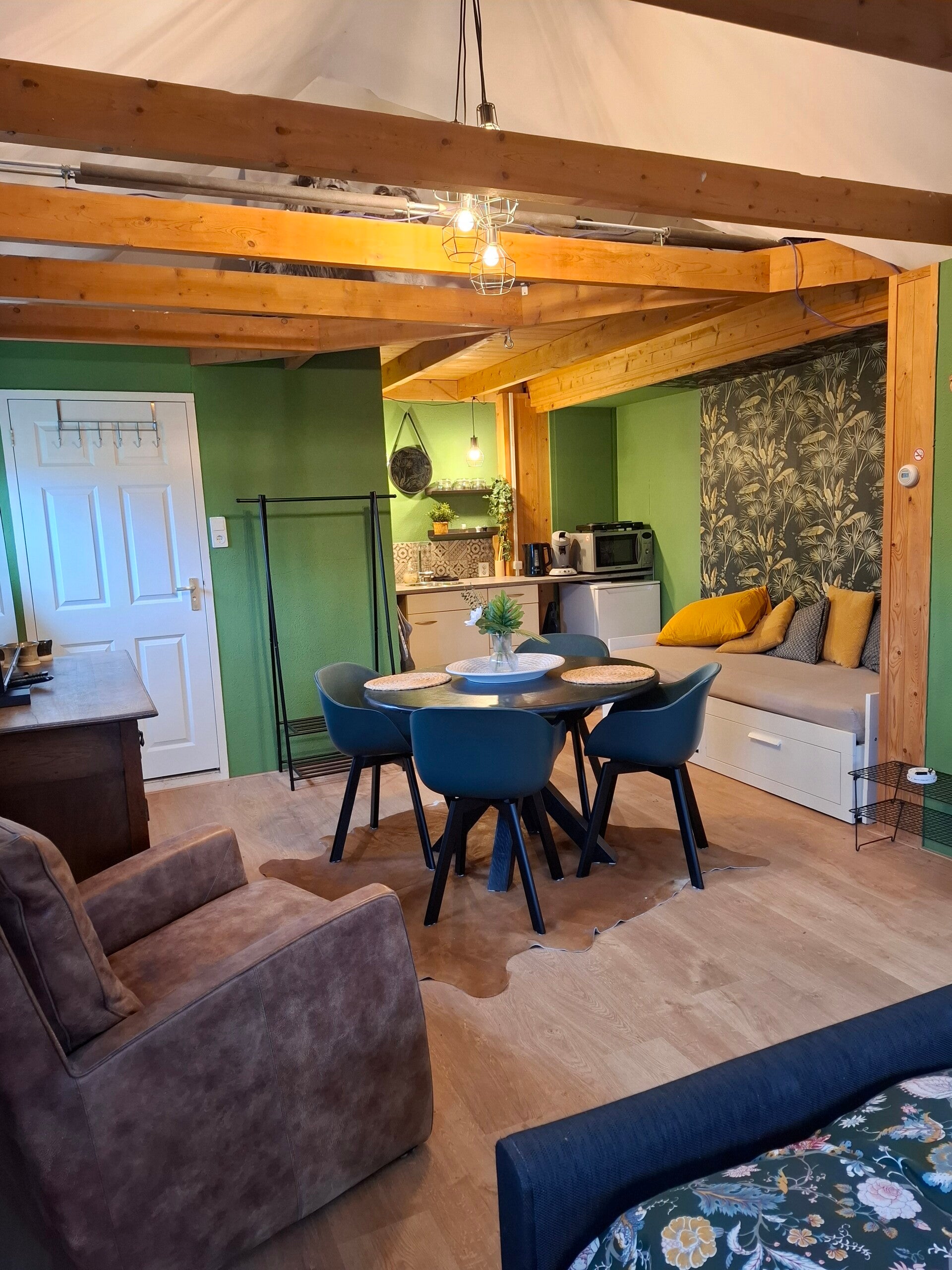 De ruimte is gezellig ingericht met een ronde tafel en 4 stoelen. Daarnaast is de (slaap)bank met kussens of de luie fauteuil een heerlijke plek om te ontspannen of om televisie te kijken. Er is uiteraard een goede wifi verbinding zodat je eventueel nog aan het werk kan, mocht dat nodig zijn.